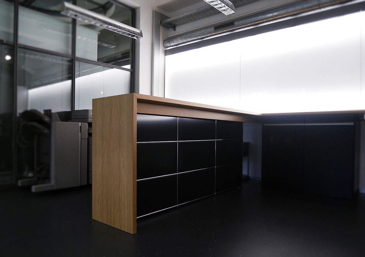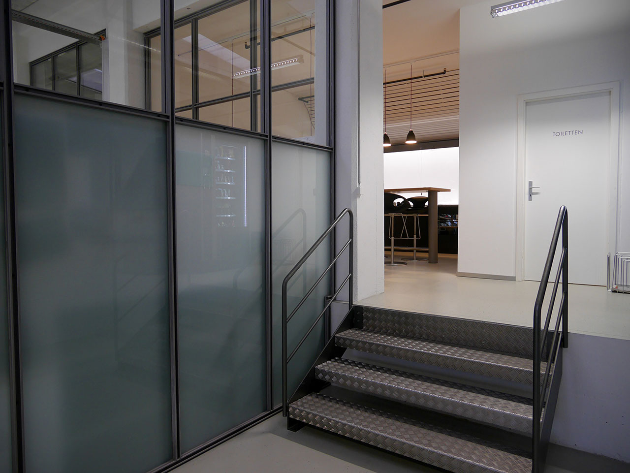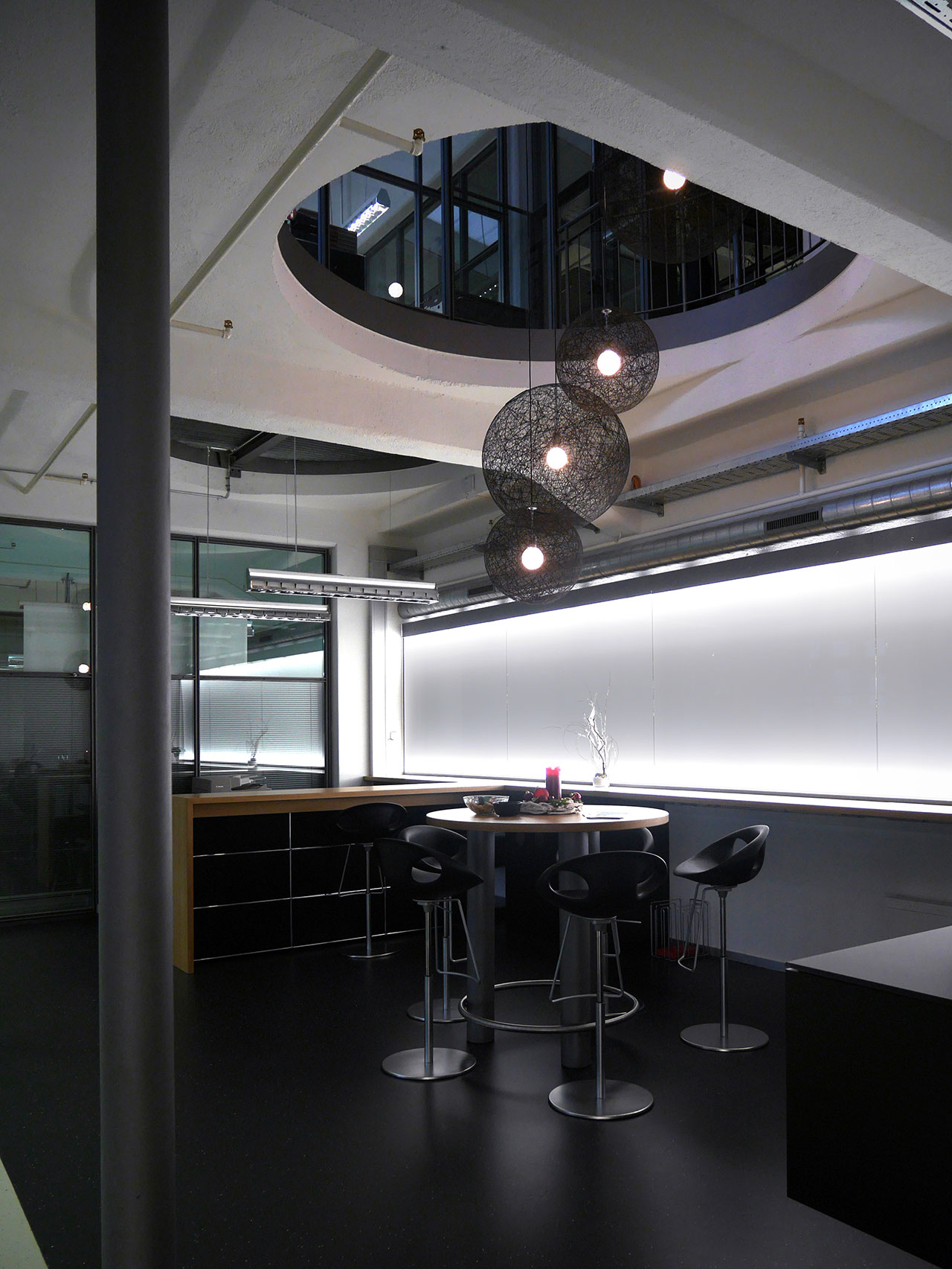 Im unverwechselbaren Stufenbau in Ittigen wurde ein Bistro für die Mitarbeiter realisiert und der Empfangsbereich neu gestaltet. Beim Planen der Einbauten und Möbel wurde auf Holz gesetzt, welches einen warmen Kontrast zum industriellen Ambiente bietet und so die Aufenthaltsräume von den Arbeitsplätzen abgrenzt.